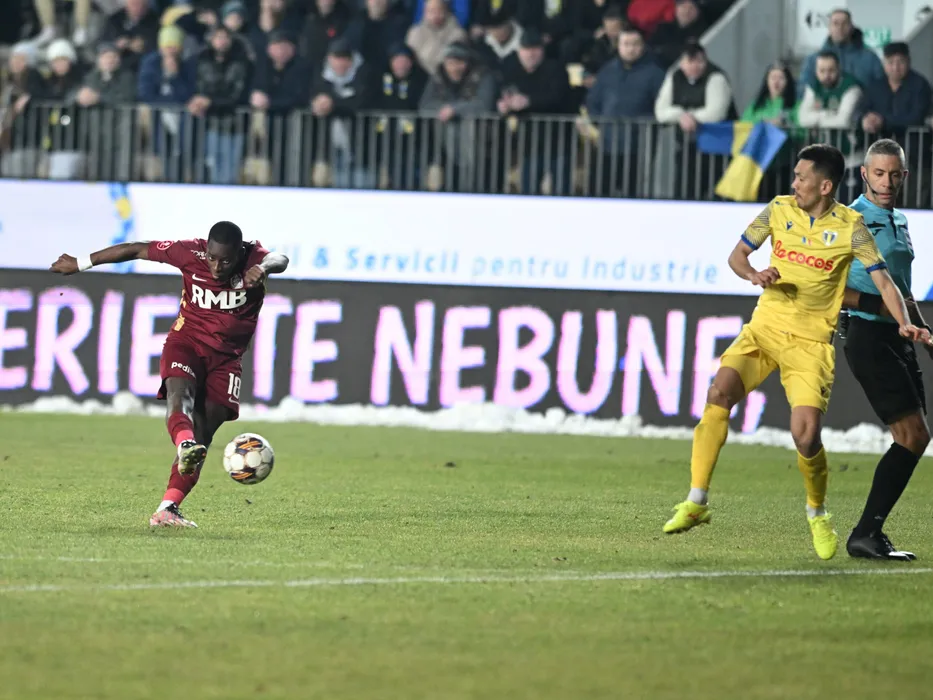 Abdul Kader Keita marchează un gol de lângă Seto Takayuki sub privirile arbitrului central Radu Petrescu în meciul de fotbal dintre Petrolul Ploiesti si CFR Cluj, contând pentru Superliga Superbet, desfășurat pe Stadionul Ilie Oana din Ploiesti, sambata 3 februarie 2024. © FOTO: Răzvan PĂSĂRICĂ/SPORT PICTURES