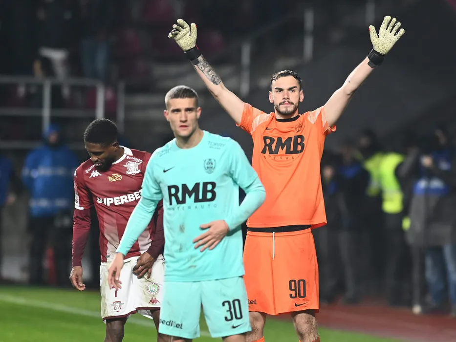 Funsho Ibrahim Bamgboye si Razvan Sergiu Sava in meciul de fotbal dintre Rapid Bucuresti si CFR Cluj, din cadrul Cupei Romaniei Betano, desfasurat pe Superbet Arena-Giulesti din Bucuresti, miercuri 6 decembrie 2023. © FOTO:Razvan Pasarica/SPORT PICTURES