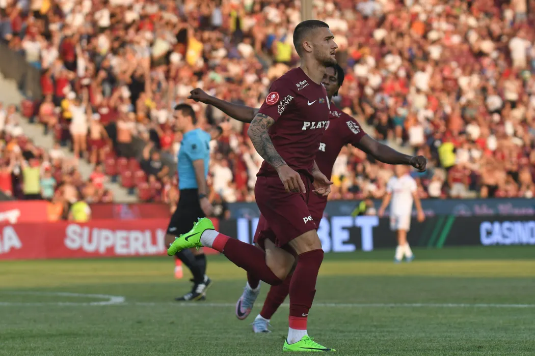 George Daniel Bîrligea după un gol marcat în meciul de fotbal dintre FC CFR 1907 Cluj si Dinamo București, contând pentru Superliga Superbet, desfășurat pe Stadionul Dr.Constantin Rădulescu din Cluj-Napoca, duminică 14 iulie 2024. © FOTO: Flaviu BUBOI/SPORT PICTURES
