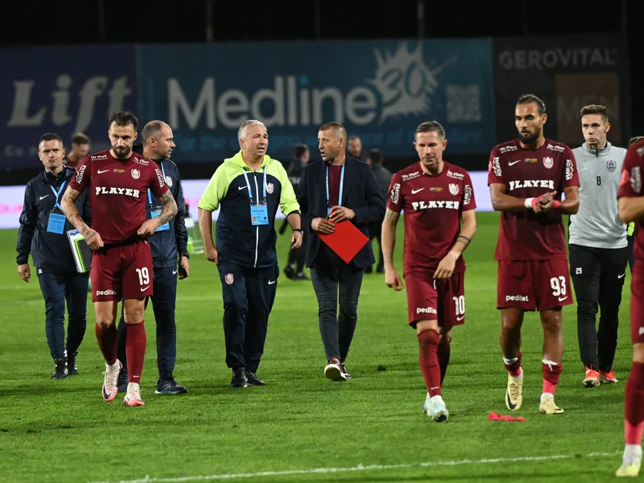 Laurențiu Daniel Rus, Dan Vasile Petrescu si Cristian Panin alaturi de fotbalistii clujeni Ciprian Ioan Deac si Louis Munteanu dupa meciul de fotbal dintre CFR Cluj si FCSB, contând pentru Superliga Superbet, desfășurat pe Stadionul Dr. Constantin Raduescu din Cluj Napoca, duminica 15 septembrie 2024. © FOTO: Răzvan Pasarica/SPORT PICTURES