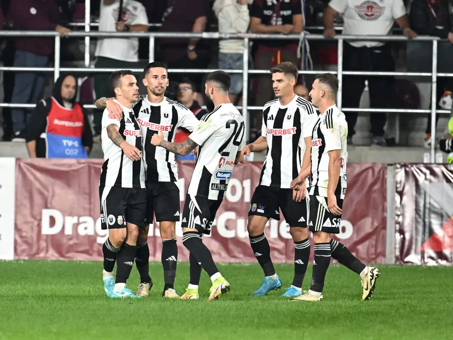 Dan Nicolae Nistor se bucură dupa un gol marcat din penalty alături de Ovidiu Alexandru Bic, Radu Stefanita Boboc, Gabriel Bogdan Simion si Robert Mihai Silaghi in meciul de fotbal dintre Rapid Bucuresti si Universitatea Cluj, din cadrul Superligii Superbet, desfasurat pe Superbet Arena-Giulesti din Bucuresti, luni 16 septembrie 2024. © FOTO:Razvan Pasarica/SPORT PICTURES