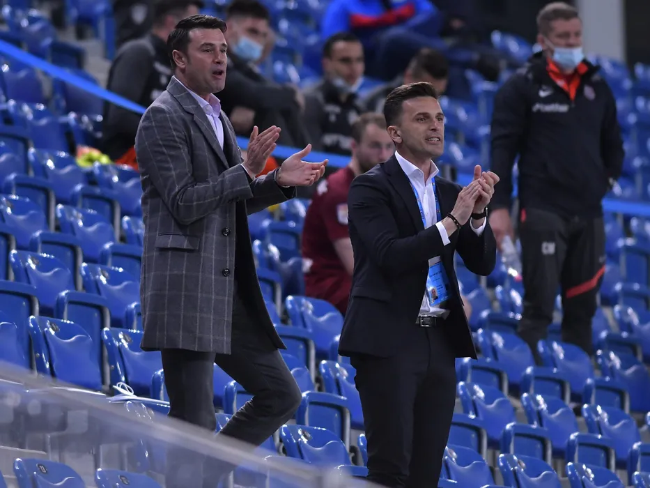 Marian Copilu si Marius Bilasco aplauda din tribuna un nou gol clujean in meciul de fotbal dintre Universitatea Craiova si CFR Cluj, contand pentru Play-off-ul Ligii 1 Casa Pariurilor, desfasurat fara spectatori pe Stadionul Ion Oblemenco din Craiova, sambata 15 mai 2021. © FOTO:Razvan Pasarica/SPORT PICTURES