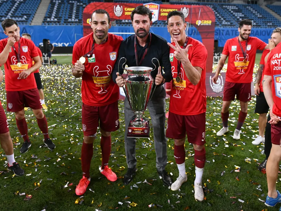 Paulo Vinicius de Souza, Marian Copilu si Mario Rondon pozeaza alaturi de trofeu dupa castigarea titlului de campioana in urma meciului de fotbal dintre Universitatea Craiova si CFR Cluj, contand pentru play-off-ul Ligii 1 Casa Pariurilor, disputat fara spectatori pe Stadionul Ion Oblemenco din Craiova, luni 3 august 2020. © FOTO:Razvan Pasarica/SPORT PICTURES