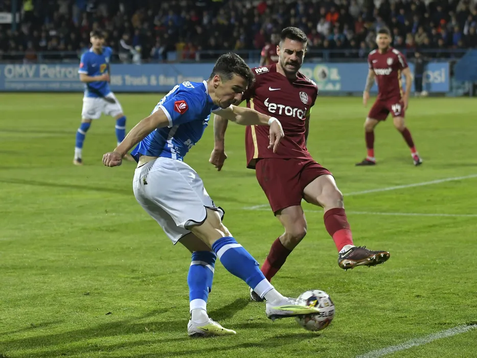 Andrei Viorel Artean si Andonie Andrei Burca in meciul de fotbal dintre Farul Constanta si CFR Cluj, contand pentru Play-off-ul Superligii Superbet, desfasurat pe Stadionul central al Academiei Gheorghe Hagi din Ovidiu, sambata 22 aprilie 2023. © FOTO:Razvan Pasarica/SPORT PICTURES