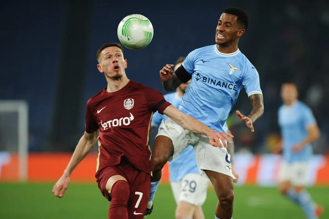 Marcos Antonio si Ermal Krasniqi in meciuL de fotbal dintre SS Lazio Roma si CFR Cluj, contand pentru Europa Conference League, desafasurat pe Stadionul Olimpic din Roma, joi 16 februarie 2023. © FOTO:© Domenico Cippitelli/IPA via ZUMA Press