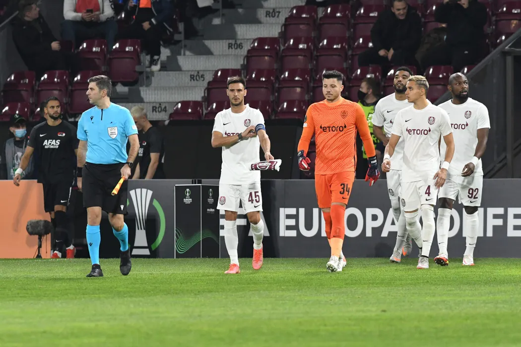Fotbalistii clujeni Mario Camora, Cristian Balgradean, Billel Abdel Slem Omrani, Cristian Marian Manea si Mike Botuli Cestor la startul meciului de fotbal dintre CFR Cluj si AZ Alkmaar, contand pentru UEFA Conference League, desfasurat pe Stadionul Dr. Constantin Radulescu din Cluj Napoca, joi 21 otombrie 2021. © FOTO:Flaviu Buboi/SPORT PICTURES