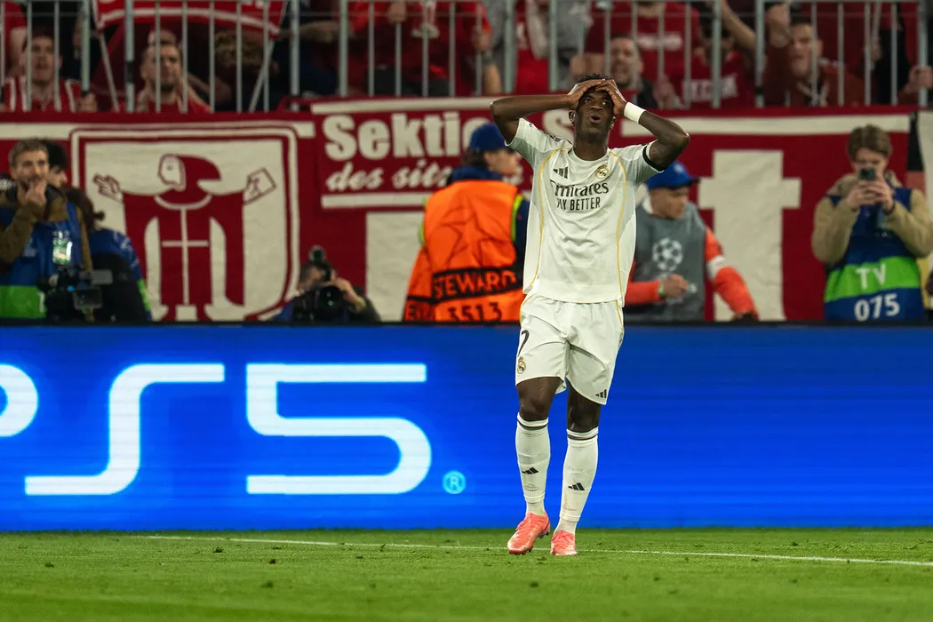 MUNICH, GERMANY - APRIL 15, 2026: Vinícius Júnior of Real Madrid reacts to the action during the UEFA Champions League Quarter-Final second leg match between FC Bayern München and Real Madrid CF at Allianz Arena on April 15, 2026 in Munich, Germany. MARC MARASESCU / MEDIAFAX FOTO