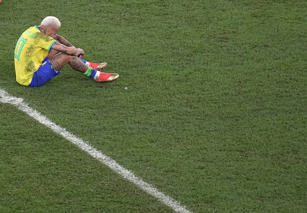 Brazil's Neymar reacts after the penalty shootout in the World Cup quarterfinal soccer match between Croatia and Brazil, at the Education City Stadium in Al Rayyan, Qatar, Friday, Dec. 9, 2022. (AP Photo/Pavel Golovkin)