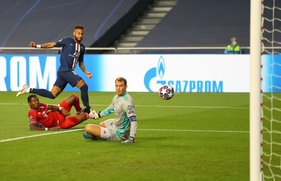 HANDOUT - 23 August 2020, Portugal, Lisbon: Paris Saint-Germain's Neymar (C) shoots wide past Bayern Munich's goalkeeper Manuel Neuer (R) during the UEFA Champions League Final soccer match between Paris Saint-Germain and Bayern Munich at the Estadio da Luz. Photo: Julian Finney/Getty Images via UEFA/dpa - ATTENTION: editorial use only in connection with the latest coverage about the transmission. The image may not be modified and can only be used in its entirety, i.e. may not be cropped. May not be archived. Only for use if the credit mentioned above is referenced in full
