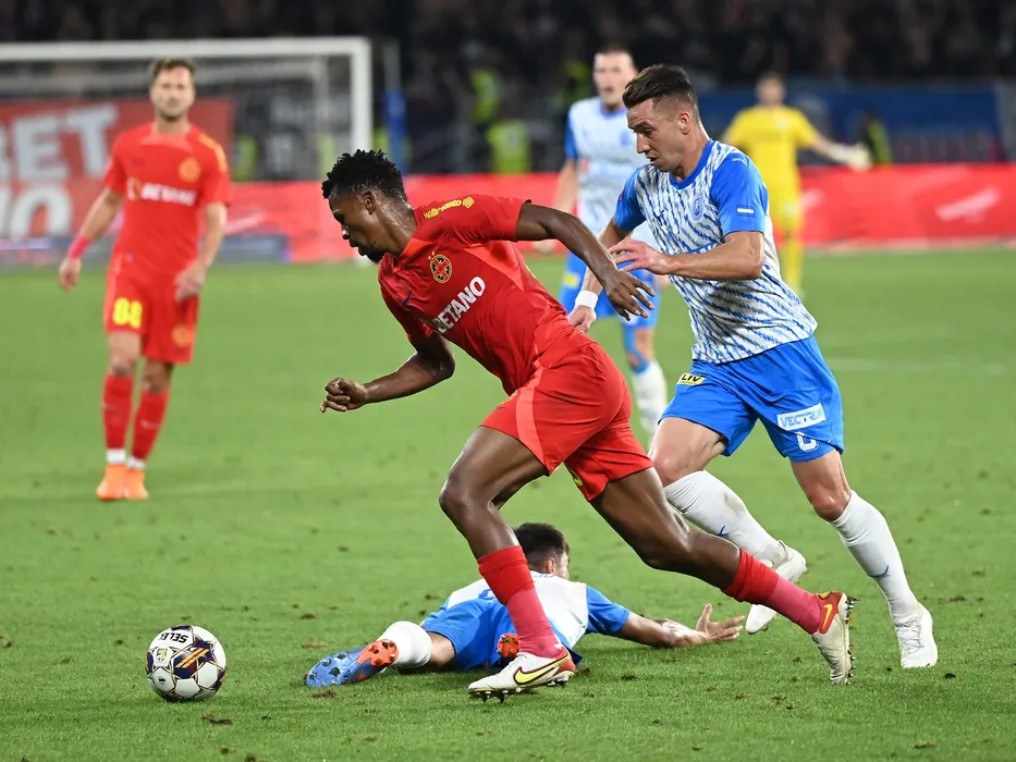Siyabonga Ngezana si Alexandru Mateiu in meciul de fotbal dintre FCSB si Universitatea Craiova, din cadrul Superligii Superbet, desfasurat pe Stadionul Steaua-Ghencea din Bucuresti, sambata 2 septembrie 2023. © FOTO:Razvan Pasarica/SPORT PICTURES