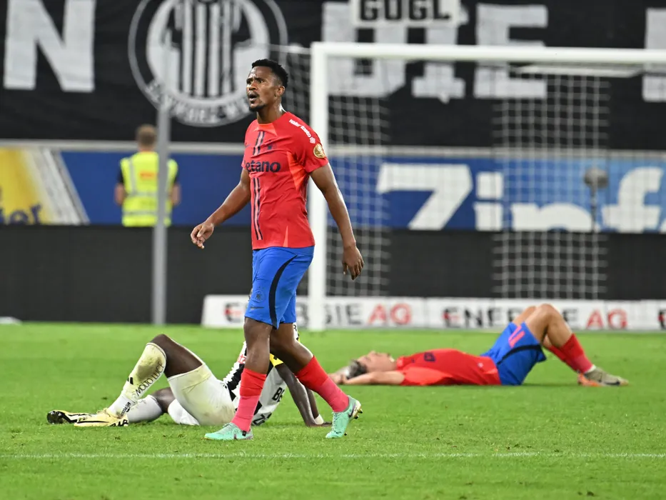 Siyabonga Ngezana reacționează dupa meciul dintre Lask Linz si FCSB, contand pentru Play off-ul Europa League, desfasurat pe Oberösterreich Arena din Linz, joi 22 august 2024. © FOTO:Razvan Pasarica/SPORT PICTURES