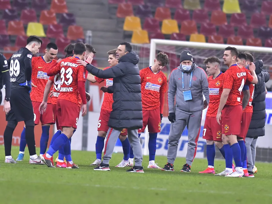 Toni Petrea isi felicita elevii Andrei Daniel Vlad, Adrian Gheorghe Sut, Gabriel Bogdan Simion, Octavian George Popescu, Darius Dumitru Olaru si Andrei George Miron dupa meciul de fotbal dintre FCSB si Chindia Targoviste, contand pentru Liga 1 Casa Pariurilor, desfasurat fara spectatori pe Arena Nationala din Bucuresti, sambata 20 februarie 2021. © FOTO:Razvan Pasarica/SPORT PICTURES