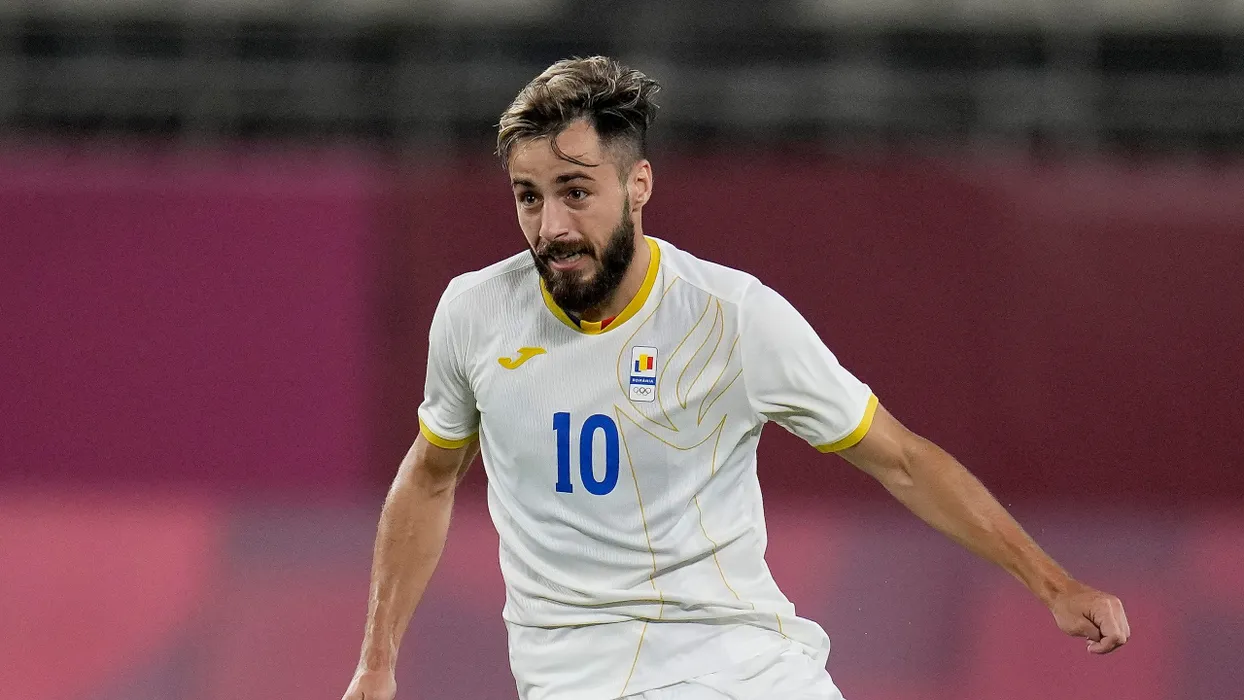 Andrei Ciobanu of Romania dribbles the ball during a men's soccer match against South Korea at the 2020 Summer Olympics, Sunday, July 25, 2021, in Kashima, Japan. (AP Photo/Fernando Vergara)