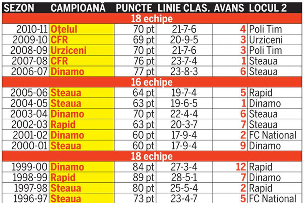 Niciodată după ’89 campioana nu s-a aflat cu mai mult de 4 etape înainte de final!** Dovada că Steaua și Dinamo mai pot spera la titlu doar dacă bat totul