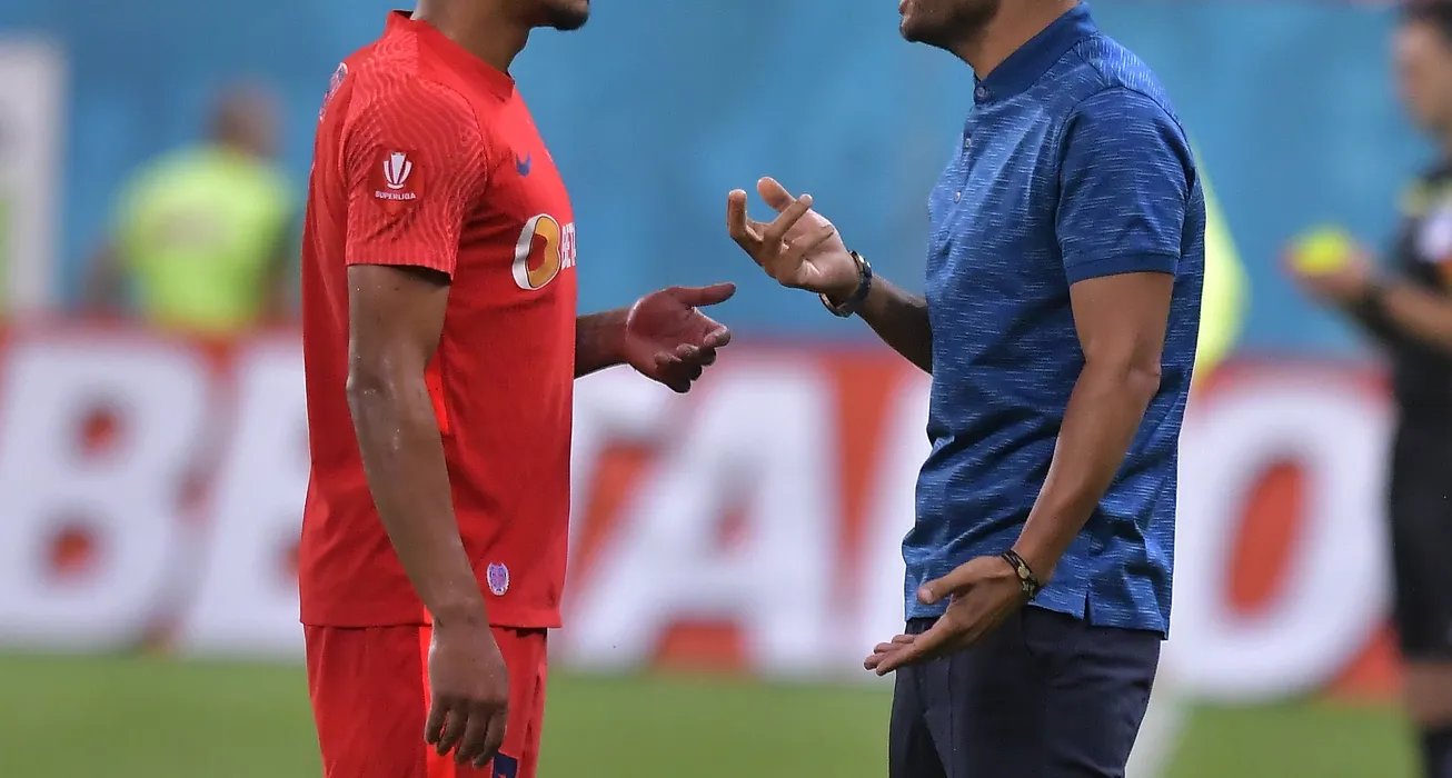 Florinel Teodor Coman discuta cu Nicolae Dica in meciul de fotbal dintre FCSB si Chindia Targoviste, contand pentru Superliga Superbet, desfasurat pe Arena Nationala din Bucuresti, duminica 14 august 2022. © FOTO:Razvan Pasarica/SPORT PICTURES