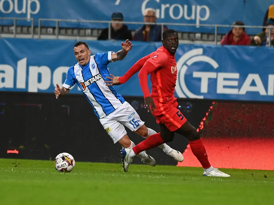Dan Nicolae Nistor si Joyskim Aurelien Dawa Tchakonte in meciul de fotbal dintre Universitatea Craiova si FCSB, contand pentru Superliga Superbet, desfasurat pe Stadionul Ion Oblemenco din Craiova, duminica 18 septembrie 2022. © FOTO:Razvan Pasarica/SPORT PICTURES