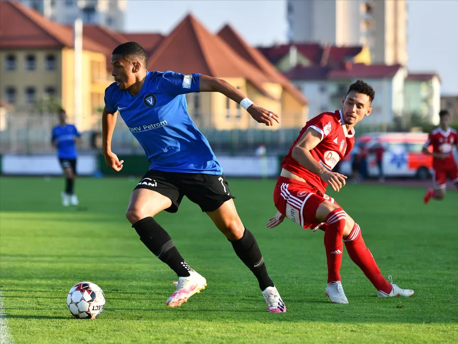 Rivaldinho si Nicolae Carnat in meciul de fotbal dintre Sepsi OSK si FC Viitorul, contand pentru play-out-ul Ligii 1 Casa Pariurilor, disputat fara spectatori pe stadionul Municipal din Sfantu Gheorghe, sambata 27 iunie 2020.