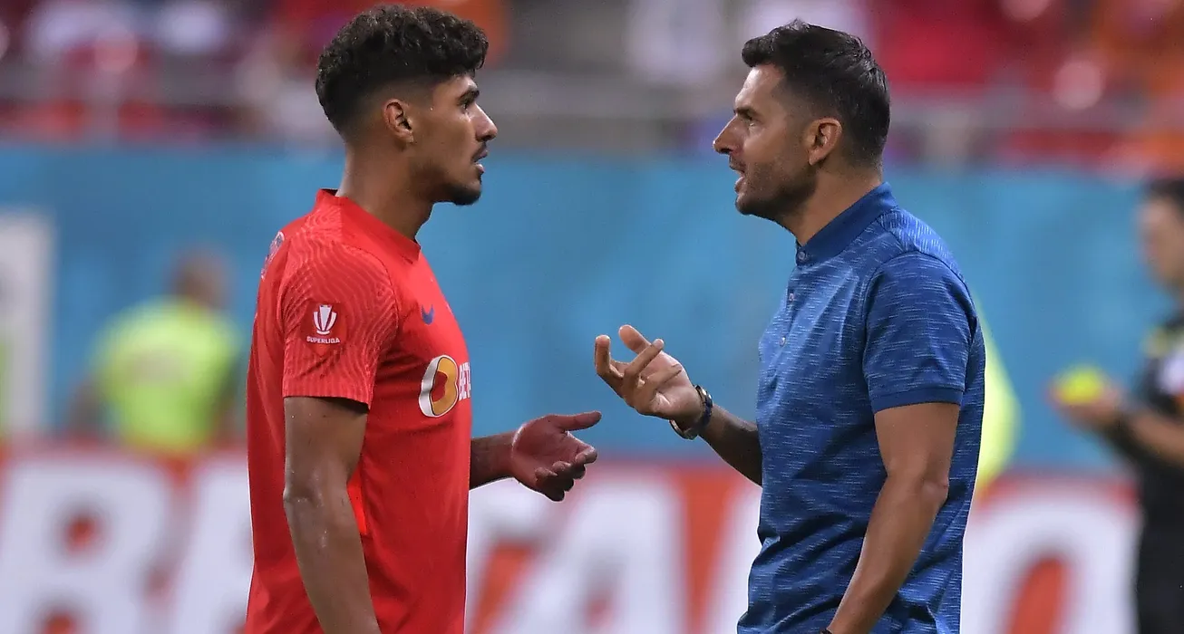 Florinel Teodor Coman discuta cu Nicolae Dica in meciul de fotbal dintre FCSB si Chindia Targoviste, contand pentru Superliga Superbet, desfasurat pe Arena Nationala din Bucuresti, duminica 14 august 2022. © FOTO:Razvan Pasarica/SPORT PICTURES