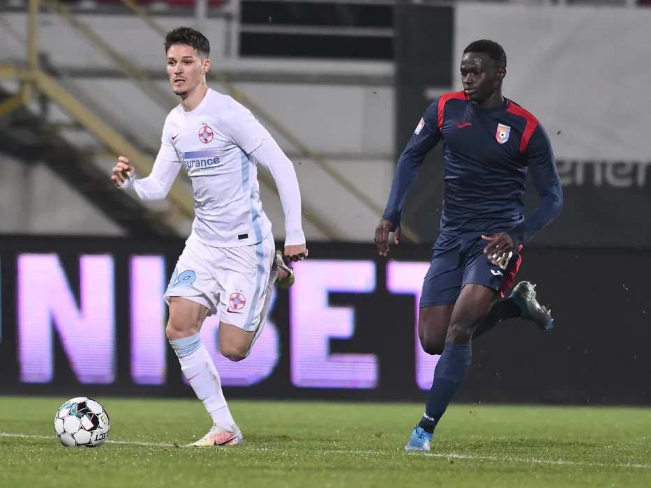 Dennis Man si Bourama Fomba in meciul de fotbal dintre Chindia Targoviste si FCSB, contand pentru Liga 1 Casa Pariurilor, desfasurat pe Stadionul Marin Anastasovici din Giurgiu, luni 2 noiembrie 2020. © FOTO:Razvan Pasarica/SPORT PICTURES