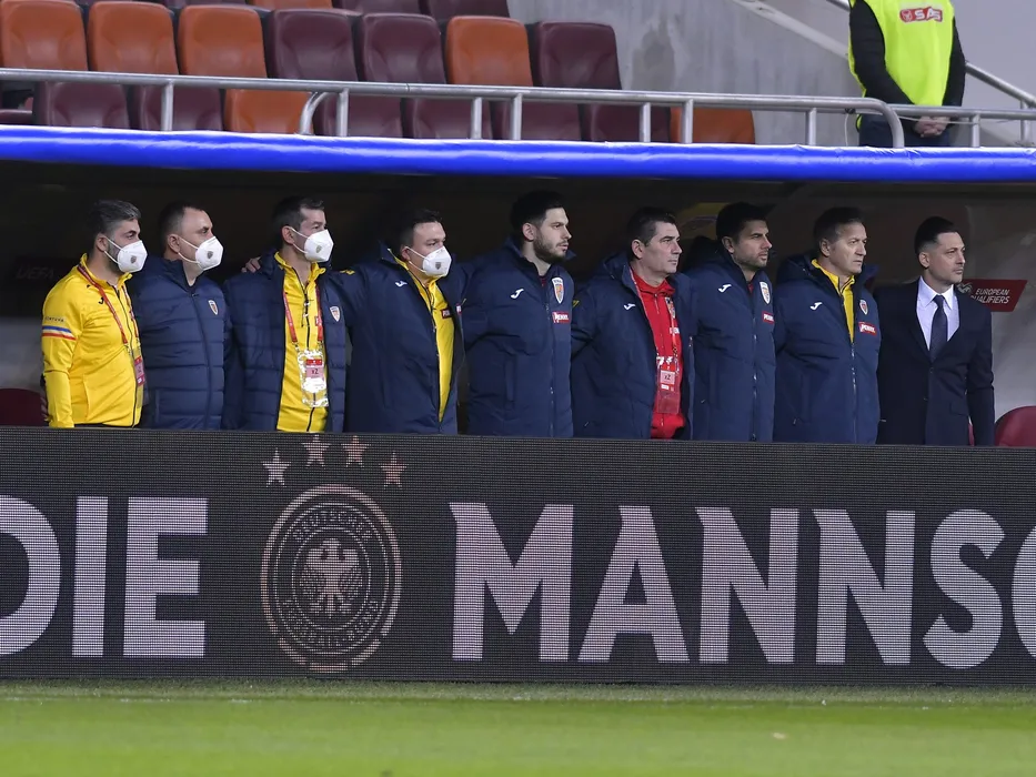 Banca Romaniei cu Leo toader, Florin Constantinovici, Nicolae Dica si Mirel Radoi in meciul de fotbal dintre Romania si Germania, din cadrul Preliminariilor Campionatului Mondial 2022, desfasurat fara spectatori pe Arena Nationala din Bucuresti, duminica 28 martie 2021. © FOTO:Razvan Pasarica/SPORT PICTURES