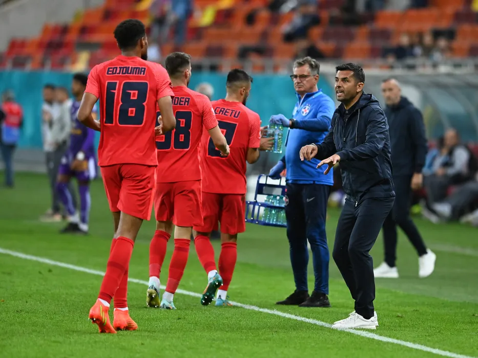 Nicolae Dica alaturi de fotbalistii stelisti in meciul de fotbal dintre FCSB si FC Arges, contand pentru Superliga Superbet, desfasurat pe Arena Nationala din Bucuresti, duminica 2 octombrie 2022. © FOTO:Razvan Pasarica/SPORT PICTURES