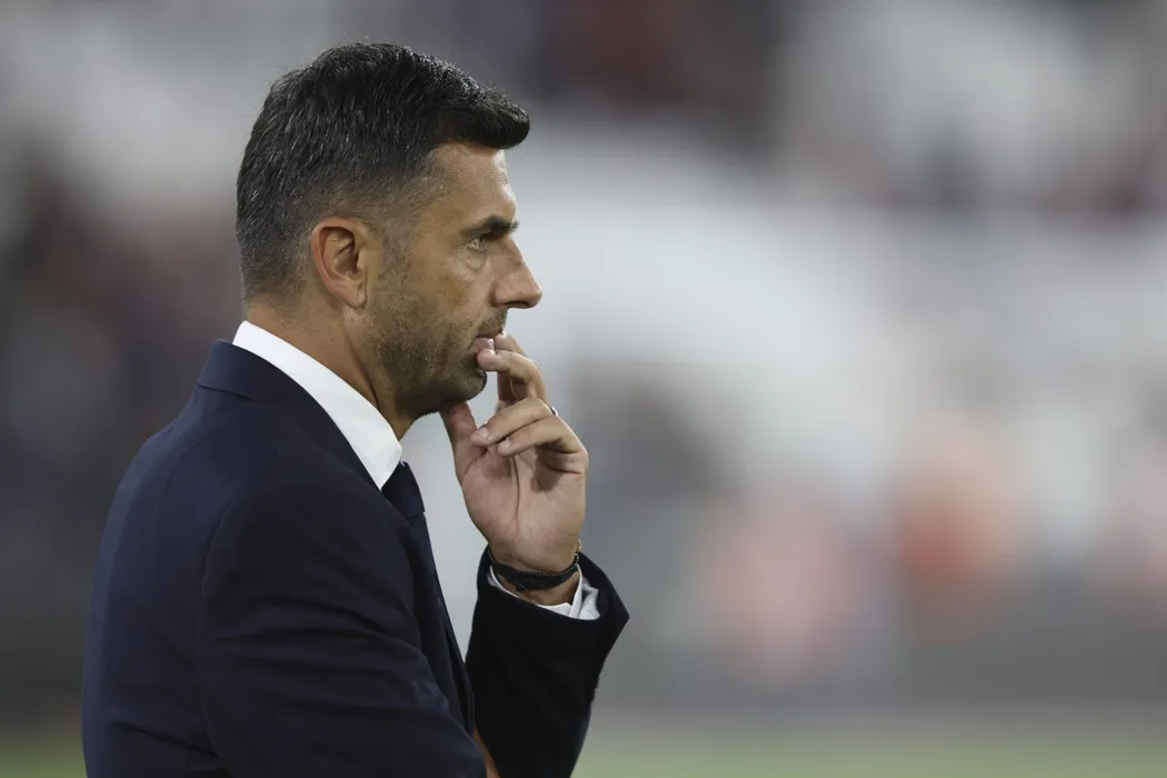 Steaua's head coach Nicolae Dica wait for the start of the Group B Europa Conference League soccer match between West Ham and FCSB Steaua Bucharest at London Stadium in London, Thursday, Sept. 8, 2022. (AP Photo/Ian Walton)