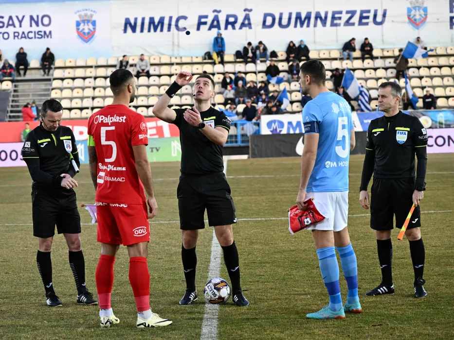 Brigada de arbitrii formata din Vasile Marinescu, Szabolcs Kovacs si Stelian Slabu alaturi de capitanii Florin Bejan si Igor Armaș în meciul de fotbal dintre FC Voluntari si FC Hermannstadt, contând pentru Superliga Superbet, desfășurat pe Stadionul Anghel Iordanescu din Voluntari, luni 5 februarie 2024. © FOTO: Răzvan PĂSĂRICĂ/SPORT PICTURES