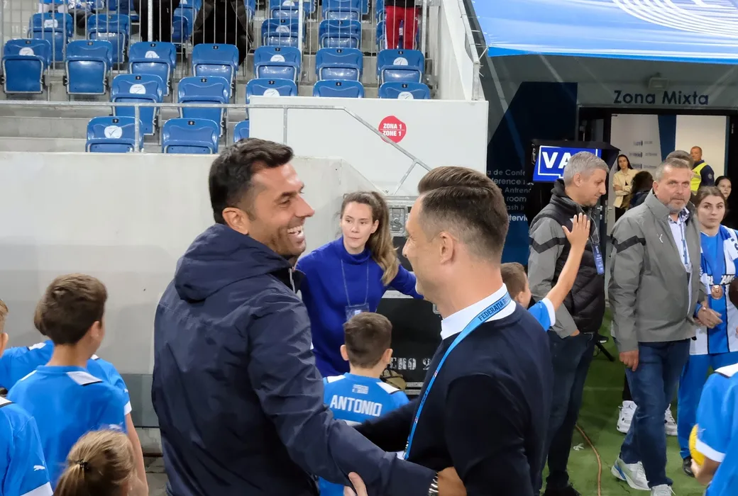 Antrenorii Mirel Radoi si Nicolae Dica se saluta inainte de inceperea meciului de fotbal dintre echipele CS Universitatea Craiova si FCSB din etapa a XI-a a Superligii, disputat pe stadionul Ion Oblemenco din Craiova, duminica, 18 septembrie 2022. REMUS BADEA / MEDIAFAX FOTO