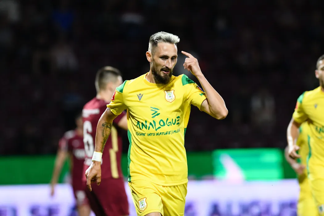 Bogdan Rusu, de la CS Mioveni, reactioneaza dupa ce a inscris un gol in timpul meciului de fotbal contra echipei CFR Cluj din etapa a III- a a Superligii, disputat pe stadionul Constantin Radulescu din Cluj-Napoca, sambata, 30 iulie 2022. FLAVIU BUBOI / MEDIAFAX FOTO