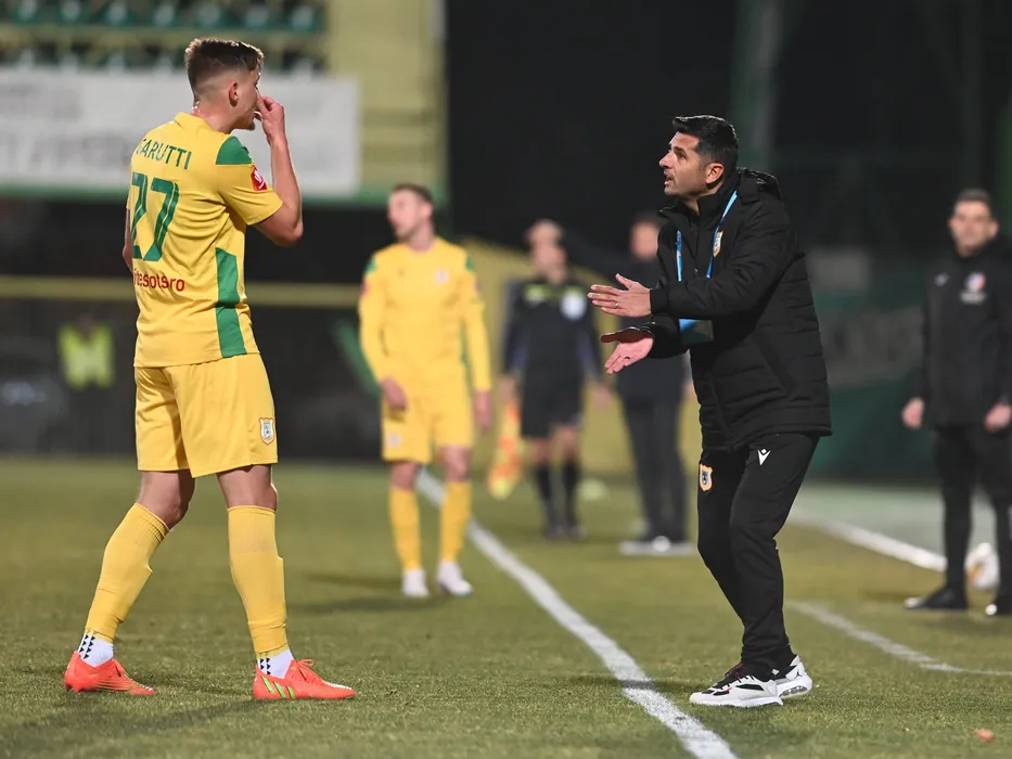 Nicolae Dica discuta cu Guilherme Gomes Garutti in meciul de fotbal dintre CS Mioveni si Rapid Bucuresti, contand pentru Superliga Superbet, desfasurat pe Stadionul Orasenesc din Mioveni, 17 februarie 2023. © FOTO:Razvan Pasarica/SPORT PICTURES