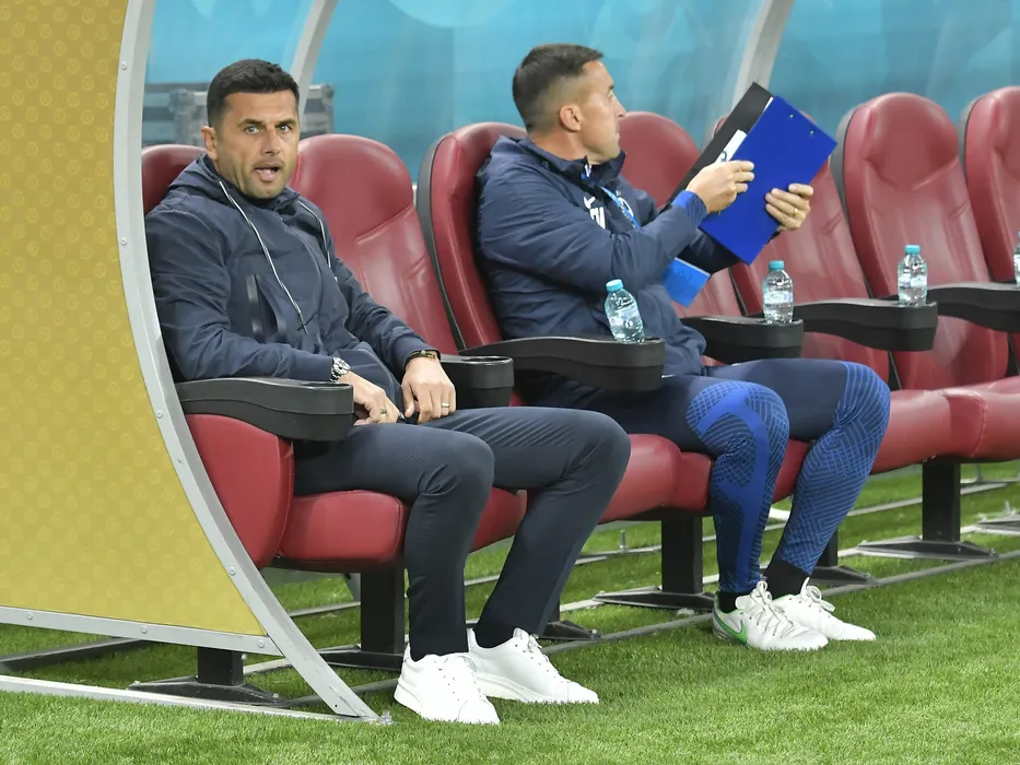 Nicolae Dica si Viorel Tanase pe banca la meciul de fotbal dintre FCSB si UTA Arad, contand pentru Superliga Superbet, desfasurat pe Arena Nationala din Bucuresti, duminica 16 octombrie 2022. © FOTO:Razvan Pasarica/SPORT PICTURES