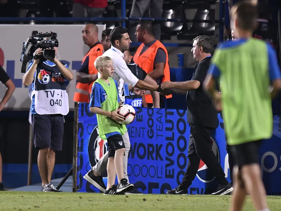 Gica Hagi se saluta cu Nicolae Dica dupa meciul de fotbal dintre FC Viitorul si FCSB, contand pentru Liga 1 Betano, desfasurat pe Stadionul central al Academiei Gheorghe Hagi din Ovidiu, duminica 26 august 2018. © FOTO Razvan Pasarica/SPORT PICTURES