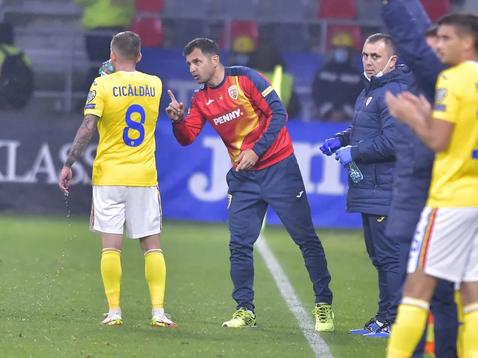 Nicolae Dica discuta cu Alexandru Cicaldau in meciul de fotbal dintre Romania si Armenia, din cadrul Preliminariilor Campionatului Mondial 2022, desfasurat pe Stadionul Steaua din Bucuresti, luni 11 octombrie 2021. © FOTO:Razvan Pasarica/SPORT PICTURES