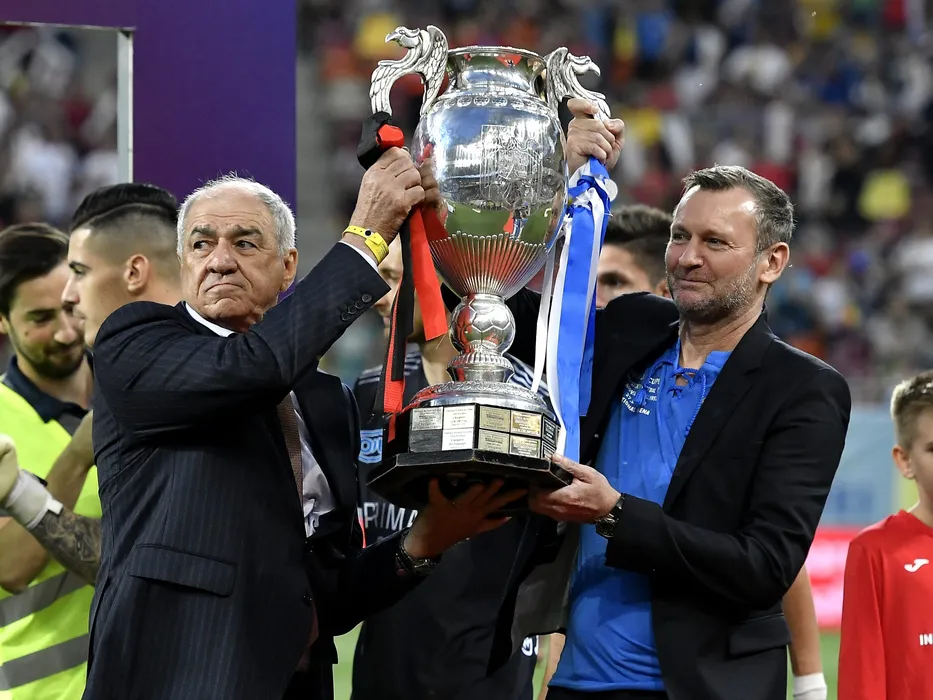 Viorel Hizo si Gica Craioveanu prezinta trofeul la meciul de fotbal dintre AFC Hermannstadt si CS Universitatea Craiova, in cadrul finalei Cupei Romaniei, desfasurata pe Arena Nationala din Bucuresti, duminica 27 mai 2018. © FOTO Razvan Pasarica/SPORT PICTURES
