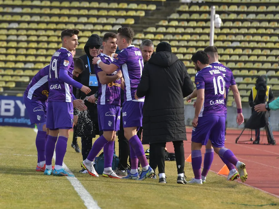 Bucurie a fotbalistilor argeseni dupa un gol marcat cu George Danut Ganea, Nicolae Constantin Musat si Cristian Tanase in meciul de fotbal dintre FC Arges si CS Mioveni, contand pentru Liga 1 Casa Pariurilor, desfasurat pe Stadionul Nicolae Dobrin din Pitesti, duminica 13 februarie 2022. © FOTO:Razvan Pasarica/SPORT PICTURES