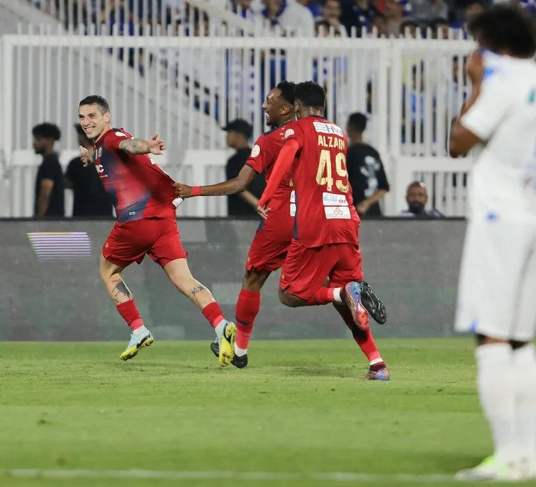 Damac's Romanian midfielder #31 Nicolae Stanciu (L) celebrates scoring his team's first goal during the Saudi Pro League football match between Damac FC and Al-Hilal SFC at Prince Sultan bin Abdul Aziz Stadium in Abha on September 21, 2023.,Image: 807238390, License: Rights-managed, Restrictions: , Model Release: no