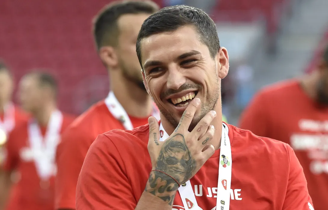 July 6, 2019 - Trnava, Slovakia - Romanian footballer Nicolae Stanciu of SK Slavia Prague, team from Czech Republic, smiles after win of the Czech-Slovak football Supercup against FC Spartak Trnava, on July 6, 2019, in Trnava, Slovakia. (Credit Image: © Dalibor Gluck/CTK via ZUMA Press)