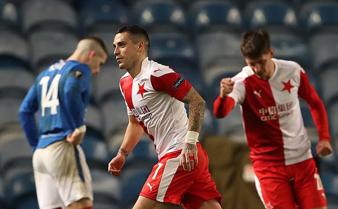 GLASGOW, SCOTLAND - MARCH 18: Nicolae Stanciu of Slavia Praha celebrates after scoring their side's second goal during the UEFA Europa League Round of 16 Second Leg match between Rangers and Slavia Praha at Ibrox Stadium on March 18, 2021 in Glasgow, Scotland. Sporting stadiums around Europe remain under strict restrictions due to the Coronavirus Pandemic as Government social distancing laws prohibit fans inside venues resulting in games being played behind closed doors. (Photo by Ian MacNicol/Getty Images)