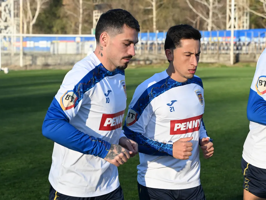Fotbalistii romani Nicolae Stanciu si Olimpiu Morutan la un antrenament efectuat inaintea meciurilor impotriva Bosniei Hertegovina si San Marino, din cadrul Preliminariilor Campionatului Mondial 2026, desfasurat la Centrul National de Fotbal de la Mogosoaia, joi 20 martie 2025. © FOTO:Razvan Pasarica/SPORT PICTURES