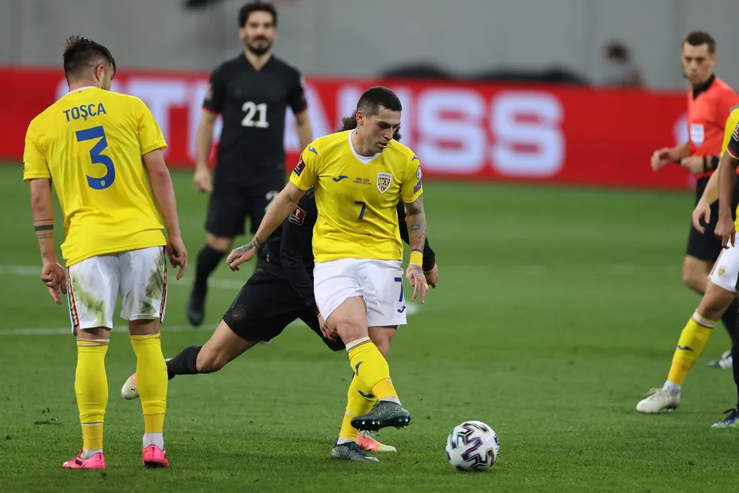 Nicolae Stanciu (C), de la nationala de fotbal a Romaniei, suteaza in timpul meciului Romania - Germania din etapa a doua a preliminariilor Campionatului Mondial, disputat pe Arena Nationala din Bucuresti, duminica, 28 martie 2021. SEBASTIAN TATARU / MEDIAFAX FOTO