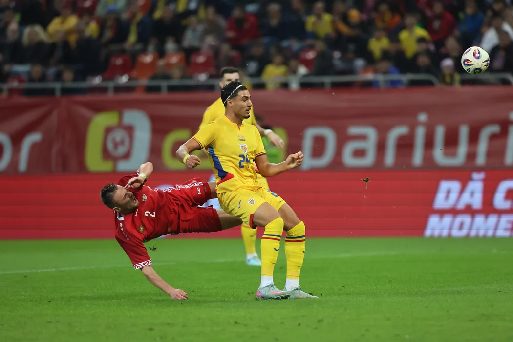 Lisav Naif Eissat (D), de la echipa nationala a Romaniei, lupta pentru balon cu Oleg Reabciuk (S), de la selectionata Moldovei, in amicalul de fotbal disputat pe Arena Nationala din Bucuresti, joi, 9 octombrie 2025. MIHAI POP / GMN / MEDIAFAX FOTO