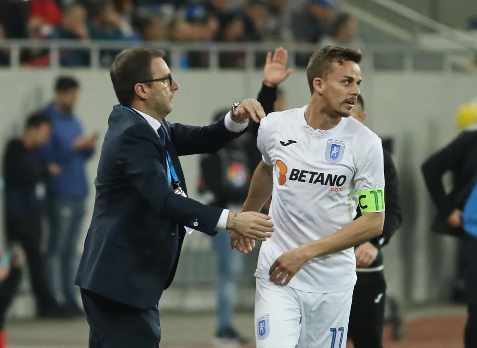 Devis Mangia (S), antrenorul echipei Universitatea Craiova, il felicita pe Nicusor Bancu (D) dupa ce a inscris un gol meciul de fotbal contra echipei FCSB din etapa a III-a a play-off-ului Ligii 1, disputat pe Arena Nationala din Bucuresti, duminica, 31 martie 2019. GEORGE FILIP / MEDIAFAX FOTO