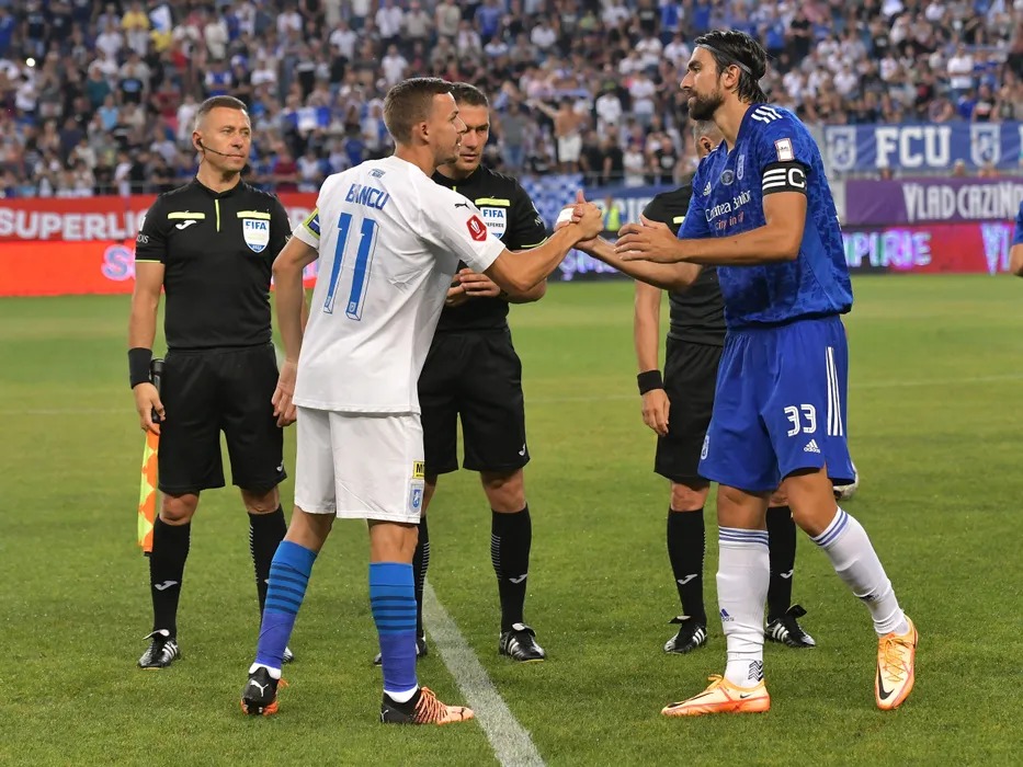 Brigada de arbitri formata din Vasile Marinescu, Istvan Kovacs si Ovidiu Artene alaturi de capitanii Nicusor Silviu Bancu si Andrea Compagno in meciul de fotbal dintre FC U Craiova si Universitatea Craiova, contand pentru Superliga Superbet, desfasurat pe Stadionul Ion Oblemenco din Craiova, duminica 7 august 2022. © FOTO:Razvan Pasarica/SPORT PICTURES