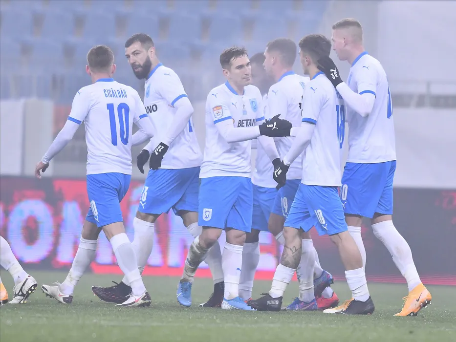 Bucurie a fotbalistilor craioveni dupa un gol marcat cu Marius Marcel Constantin, Bogdan Ilie Vatajelu si Ivan Mamut in meciul de fotbal dintre Progresul Spartac Bucuresti si Universitatea Craiova, contand pentru Cupa Romaniei, desfasurat fara spectatori pe Stadionul Ion Oblemenco din Craiova, vineri 27 noiembrie 2020. © FOTO:Razvan Pasarica/SPORT PICTURES
