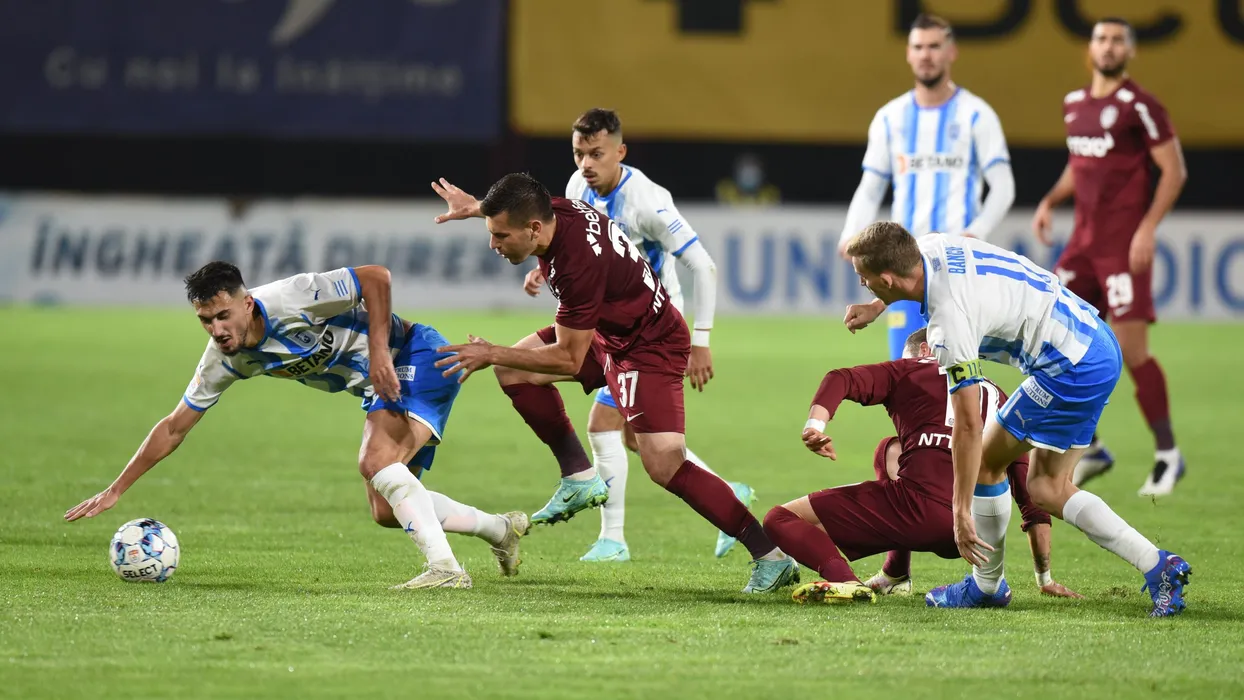 Mihai Bordeianu (CS), de la CFR Cluj, lupta pentru balon cu Andrei Ivan (S), de la CS Universitatea Craiova, in meciul de fotbal din etapa a IX - a a Ligii 1, disputat pe stadionul Dr. Constantin Radulescu, luni, 20 septembrie 2021. DAN HORIA TAUTAN / MEDIAFAX FOTO