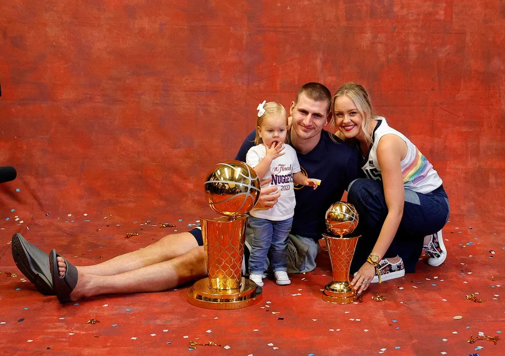 Jun 12, 2023; Denver, Colorado, USA; Denver Nuggets center Nikola Jokic (15),his wife Natalija and daughter Ognjena sit with the Larry O’Brien Trophy and the Bill Russell NBA Finals MVP trophy after the Nuggets won the NBA championship by defeating the Miami Heat in game five of the 2023 NBA Finals at Ball Arena.,Image: 783070719, License: Rights-managed, Restrictions: , Model Release: no