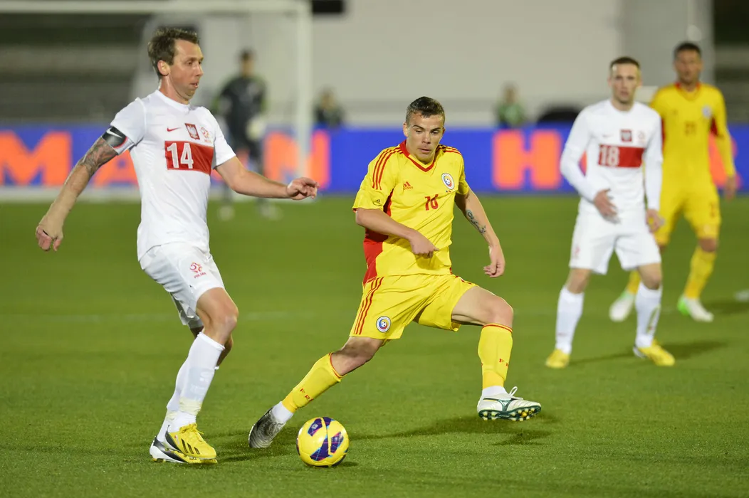 Dan Nistor (D), de la nationala Romaniei, isi disputa balonul cu un adversar de la selectionata Poloniei, intr-un meci amical, la Malaga, sambata, 2 februarie 2013. BOGDAN IORDACHE / MEDIAFAX FOTO