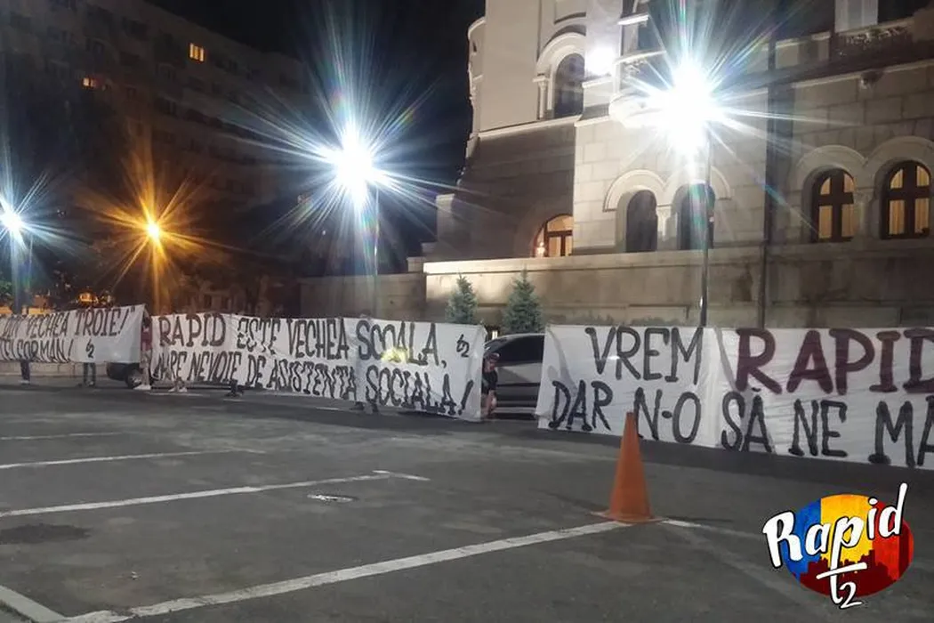 Noaptea în care fanii au spus NU operațiunii „Rapid pentru Partid”: „Un strigăt din vechea Troie, nu din Teleorman!” / „Vrem Rapidul înapoi, dar n-o să ne mânjim și noi!”. Suporterii de la T2 au protestat în fața Primăriei Sectorului 1