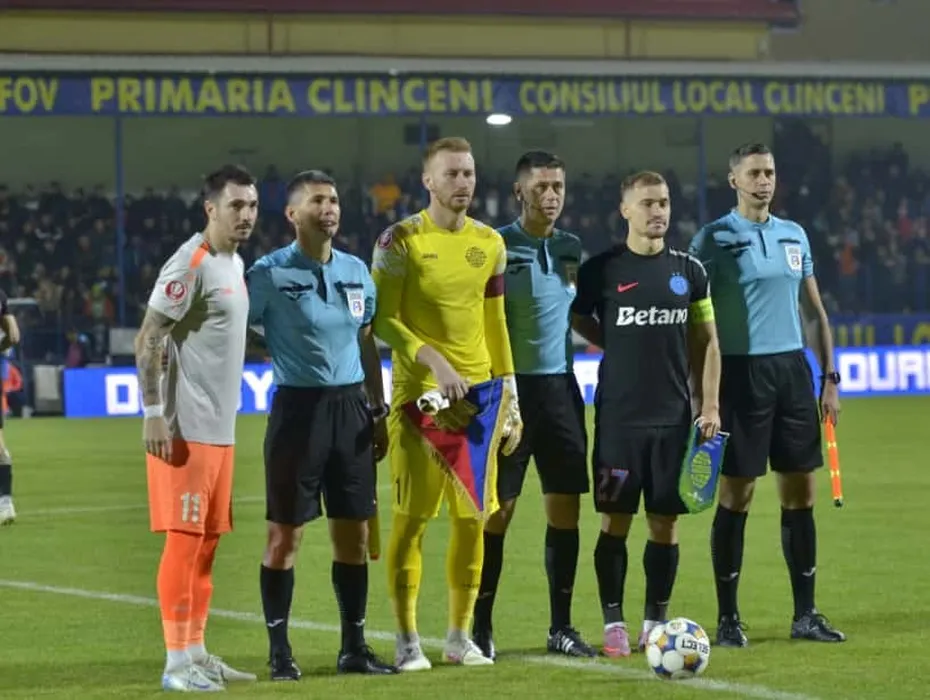Brigada de arbitrii formata din Mircea Orbulet, Robert Avram si Mihaita Necula alaturi de capitanii George Petrisor Gavrilas si Darius Dumitru Olaru si Dragos Ionut Huiban la startul meciului de fotbal dintre Metaloglobus Bucuresti si FCSB, contand pentru Superliga Superbet, desfasurat pe Clinceni Arena din Clinceni, sambata 18 octombrie 2025. © FOTO:Alexandra Cristina Grigorescu/SPORT PICTURES
