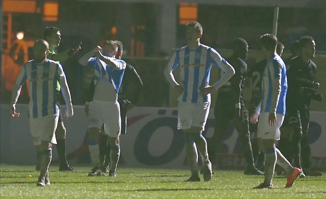 Fotbalistii ieseni printre care Andrias Cristian Calcan si Dzenan Zajmovic parasesc tristi terenul dupa oprirea nocturnei in timpul meciului de fotbal dintre CSM Politehnica Iasi si FC Viitorul Constanta, contand pentru Liga 1 Casa Pariurilor, desfasurat fara spectatori pe Stadionul Emil Alexandrescu din Iasi, duminica 1 noiembrie 2020. © FOTO:Razvan Pasarica/SPORT PICTURES